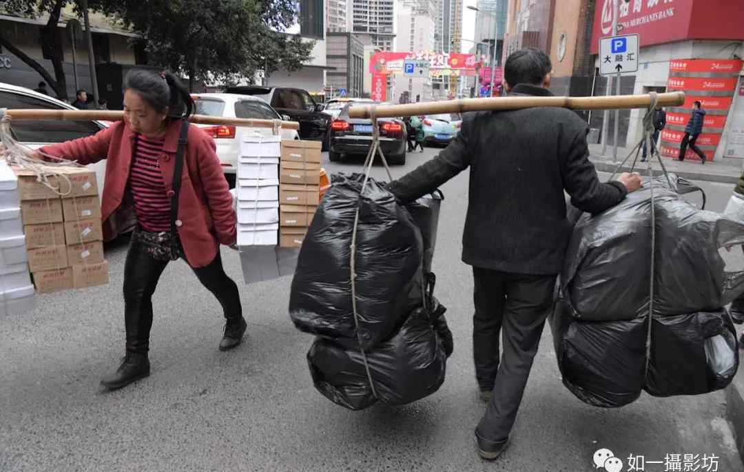棒棒是一种古老职业,替人挑担扛包运货,年龄大多四五十岁,有的甚至六七十岁,个子矮小,人极精壮,手指常年使用重力,关节粗得变形。他们每天扛着一根一米多长、腕粗的竹竿,两根三四米长的绳子绾在竹竿中间,满街溜达,看到货车停下赶紧围上去兜生意,凭劳力挣辛苦钱。其实他们各有自己的地盘——主要在朝天门各个商场门口,长年积累起来的顾主,很默契,一担10元,挑去车站码头,运气好一天二三十担,运气差一天六七担。棒棒大多来自渝东农村,在城里租房子,说是租房子,其实是七八人一间的统铺,一张1.5米宽的床,月租金二百元;夫妻俩住小单间,月租金千元。早餐,五个包子两元钱;午餐,一碗蕃薯糯米饭5元钱;晚餐,一碗重庆小面10元钱。棒棒大多抽烟,买不起纸烟,抽大叶子烟。