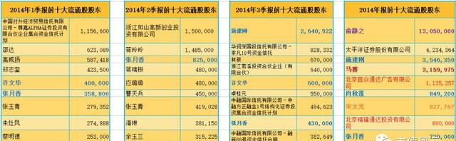 注意看的小伙伴们,应该都发现了,施建刚、马赛以及北京宜众通达广告有限公司、北京瑞福通达投资有限公司等投资者(机构)在2014年4季度精准进入前十大流通股股东列表,肖秋莲、张月香(此二人的公开市场信息较少)则是从2014年1季度开始就频繁出现在十大流通股股东列表中。