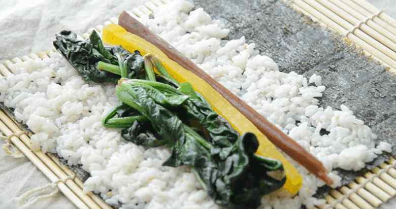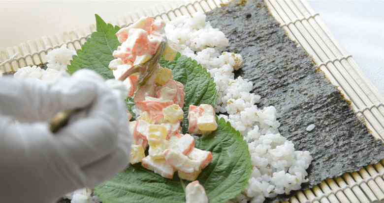 记得在海藻边缘铺足够的食物,这样边卷起来就不会塌了