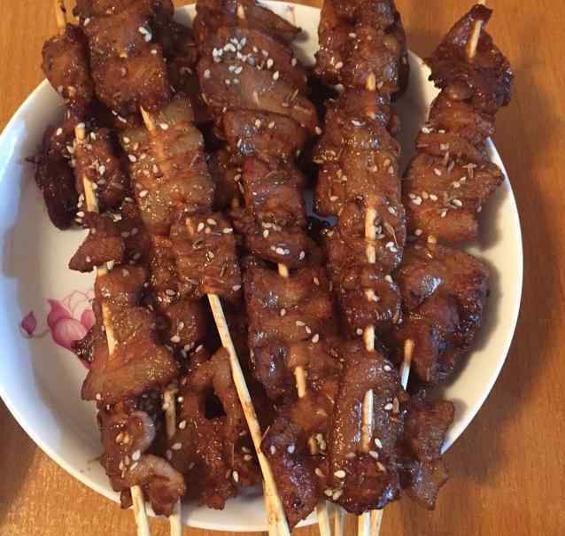 穿竹签!也可以切成大块,用油纸直接放在烤盘上烤。我更喜欢用手吃饭!说出来有好感!