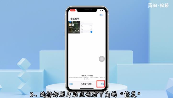 3.选择好照片后,点击右下角的“恢复”,在弹出的窗口中点击恢复照片。