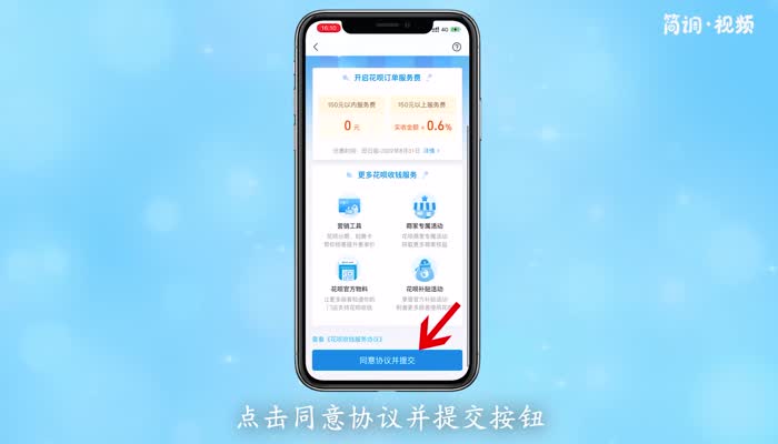 3.页面跳转后,将手机屏幕滑动到底部,点击“同意协议并提交”按钮,商家的花呗支付就成功开通了;