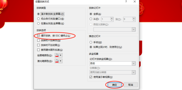 勾选【循环放映】选项,播放幻灯片后,点击【ESC】可以【暂停/播放】。