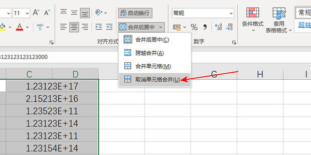 - 点击合并后居中下拉箭头,点击取消单元格合并。