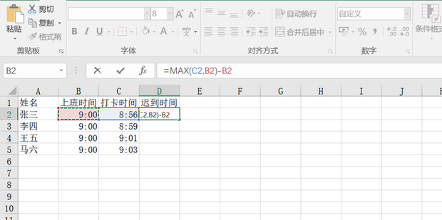 - 输入公式=MAX(C2,B2)-B2,在上班时间和打卡时间上选取最大时间,然后减去上班时间就是迟到的时间。
