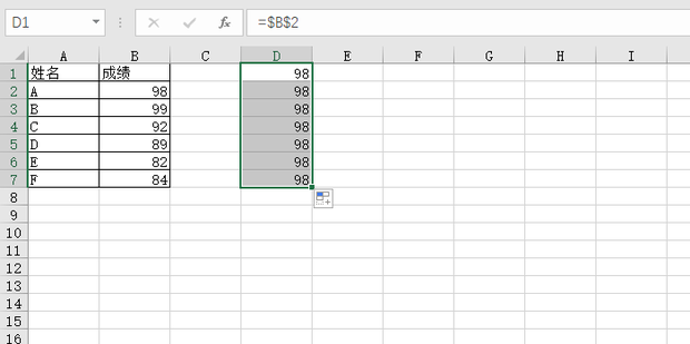 - 按住填充柄往下填充,可以发现不管填充多少单元格,都是B2单元格的值。