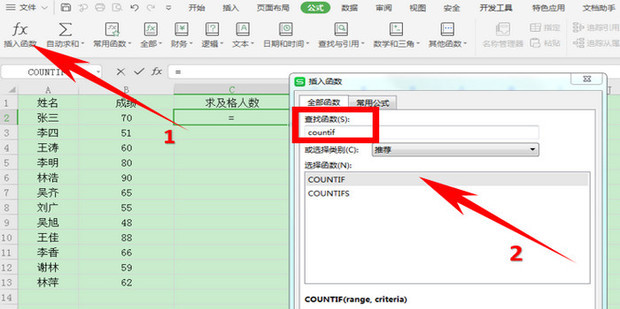 - 单击及格人数下方的单元格,直接输入等号和公式,也可以在工具栏中选择【公式】下的【插入函数】,在弹出的对话框里输入函数公式countif,然后会有一个对话框。
