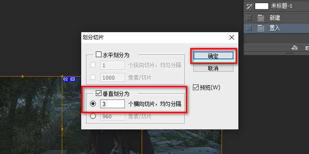 - 垂直划分为【3个横向切片,均匀分隔】,点击确定。