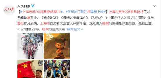上海首批205家电影院将于28日起恢复运营。《流浪地球》《哪吒:恶魔之子的诞生》《狼斗士2》《中国合伙人》等近20部影片参加了首映式。