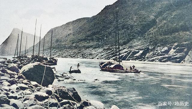 1905年,长江上游的急流中的舢板,正被两名纤夫以缆绳向在岸边牵引。