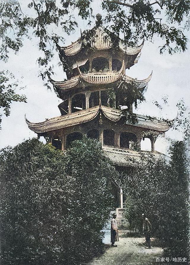 1905年,位于长江上游的一座塔,塔好像坐落在园林中,有专人负责清扫打理。
