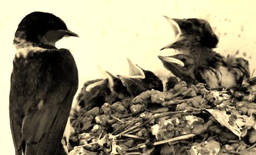 幸运的是,有四窝燕子在他做的巢穴里产了蛋并孵了小燕子。