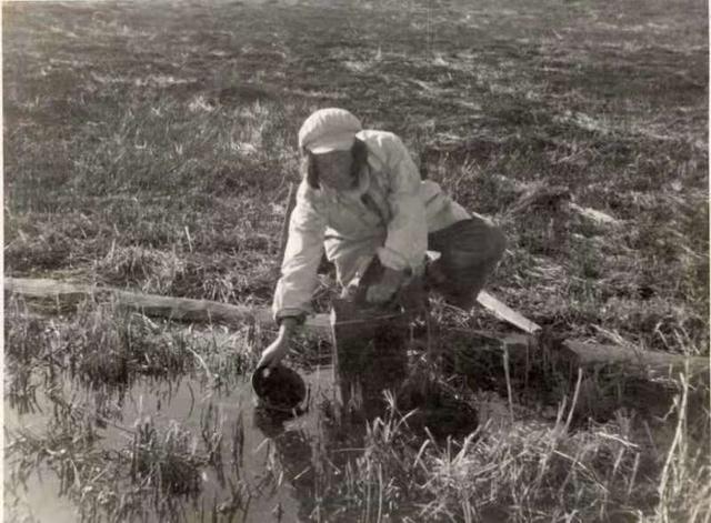 梁军在开荒时期从荒原沟里取水做饭。受访者供图