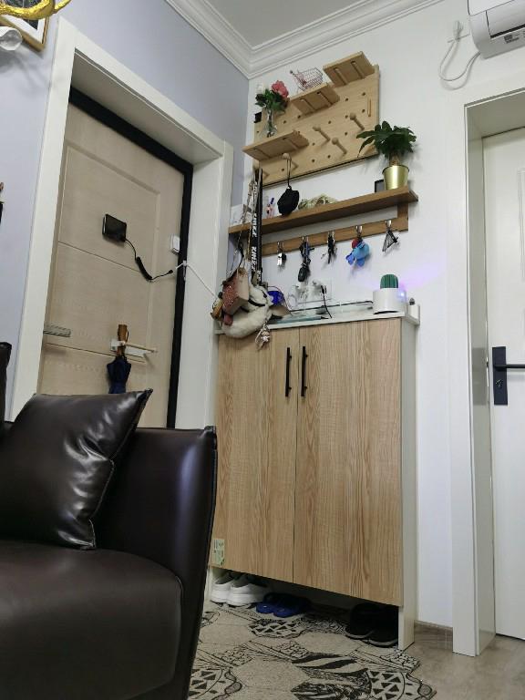 一进来是没有真正意义的玄关,入户门口的旁边布置了比较薄小的鞋柜,可以适当增加蛮不错的储物空间。大门上有个磁吸的花伞置物架,可以方便挂雨伞,特别棒。猫眼是不可缺少的一部分,不过当初选择的是电池的,并不是那么耐用。鞋柜墙上的利用,安装了洞洞板,其实就是挡住后面的配电箱,遮挡起来比较美观。同时洞洞板可以适当挂一些小物件的东西。还专门有挂钥匙挂钩,这也是不可缺少的一部分。
