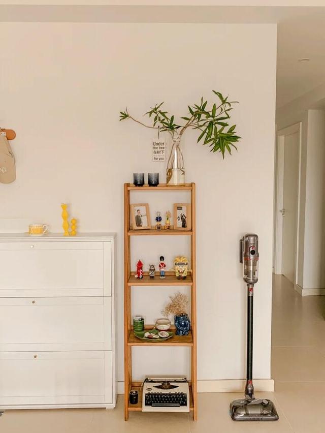 户主给自家玄关做了一些简单的布置,虽然简单但一家人的日常使用也是完全足够了,进门的左手边设立了一个白色的成品鞋柜,收纳一家人的鞋子基本没啥问题,鞋柜的旁边摆放了一个木色的置物架,主要放置一些喜欢的装饰品、照片和小件的日用品等。