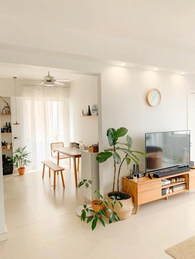 户主家的软装整体以木质家具为主,客厅搭配原木风的茶几、边几、电视柜,让整个空间变得舒适又温馨,超喜欢原木风家具的那种质感。