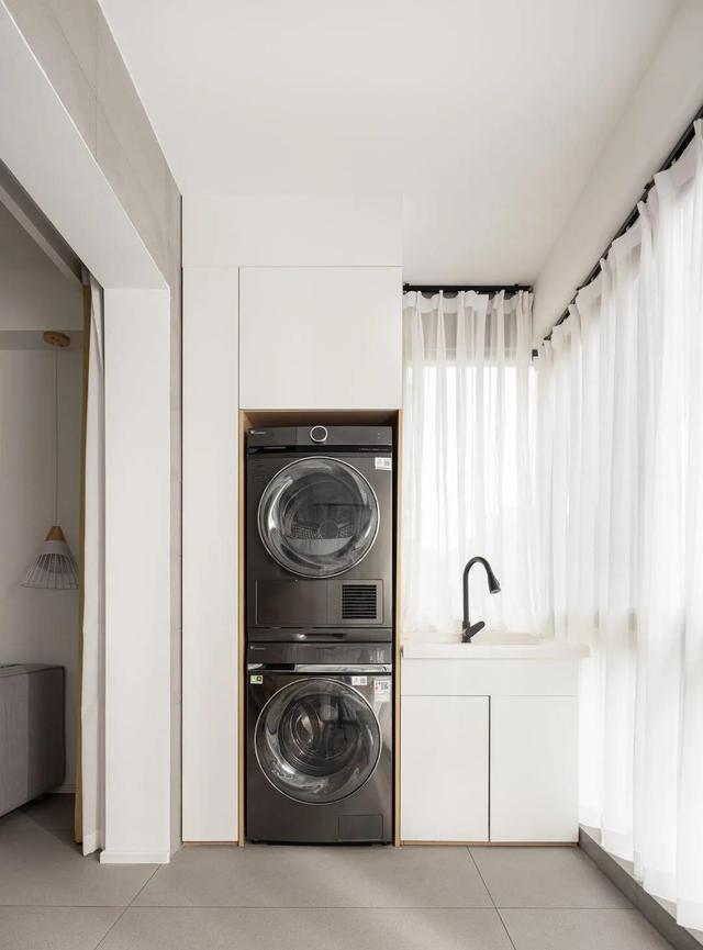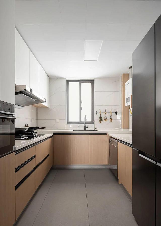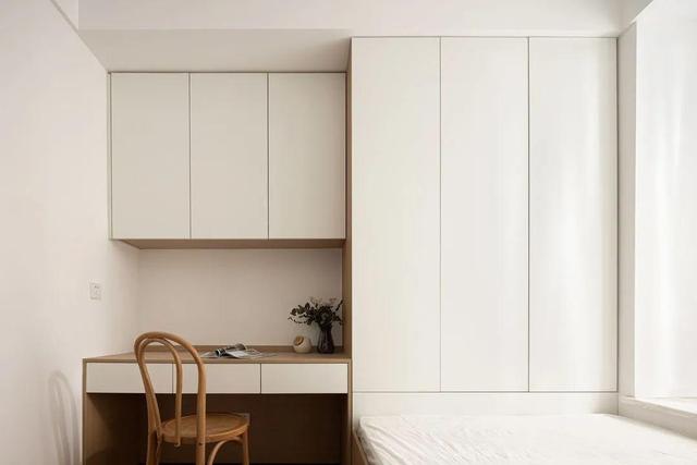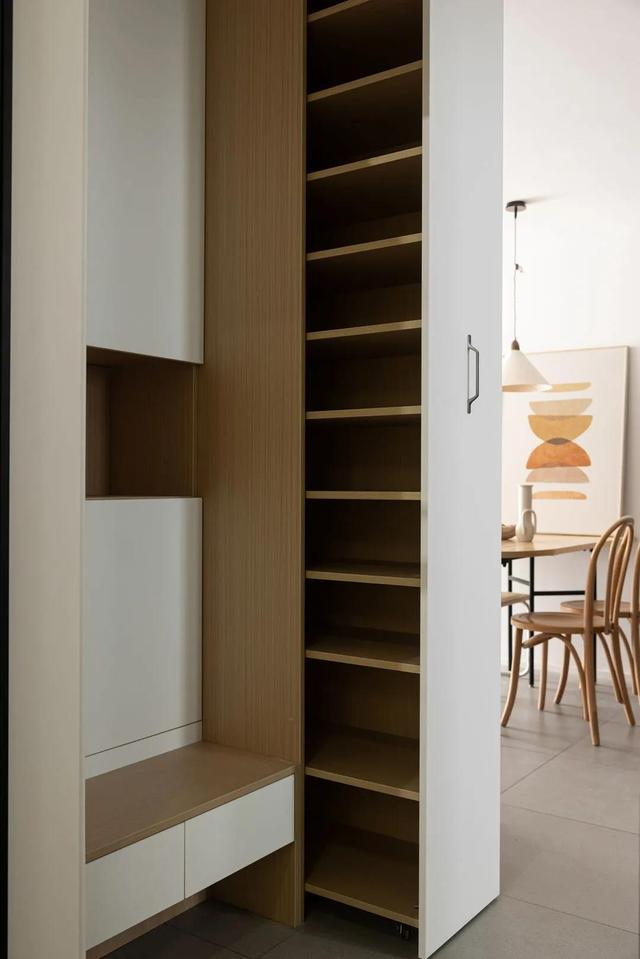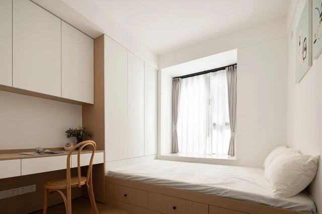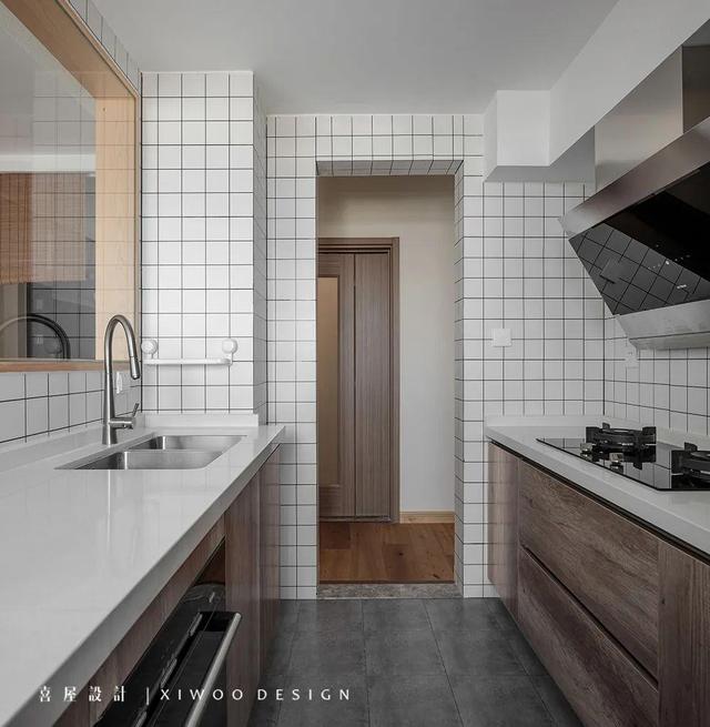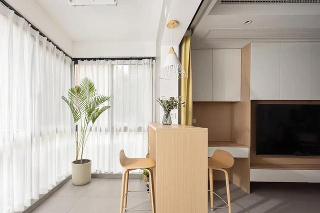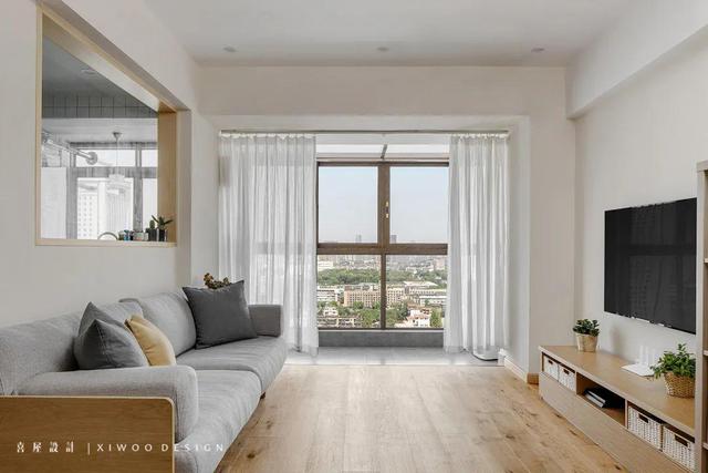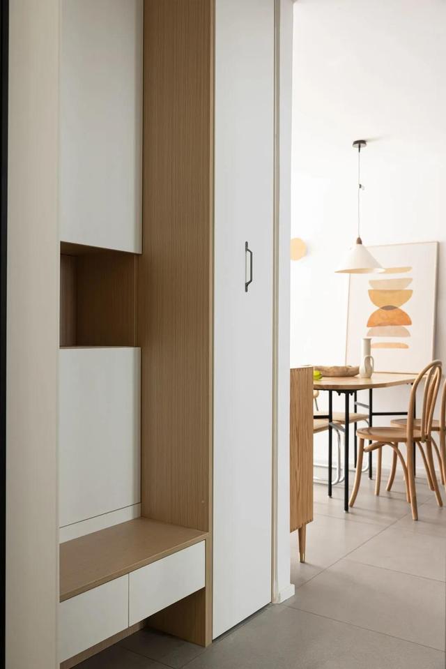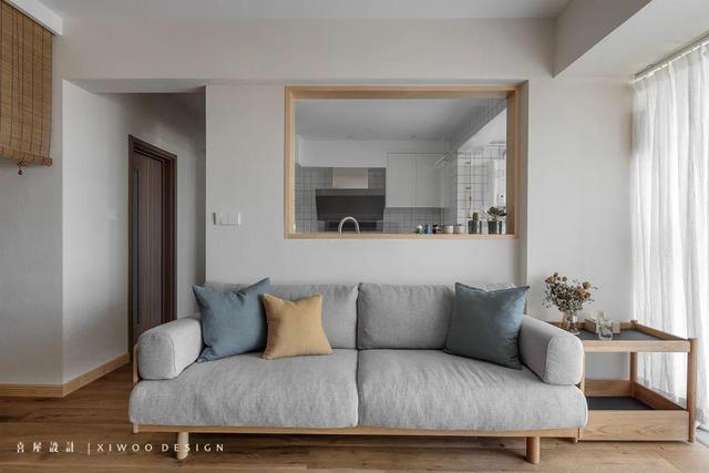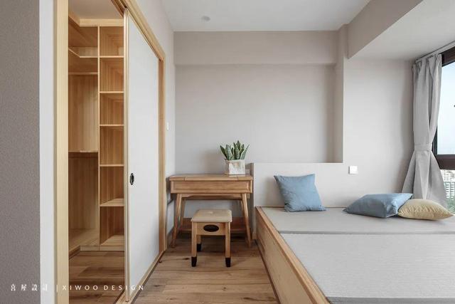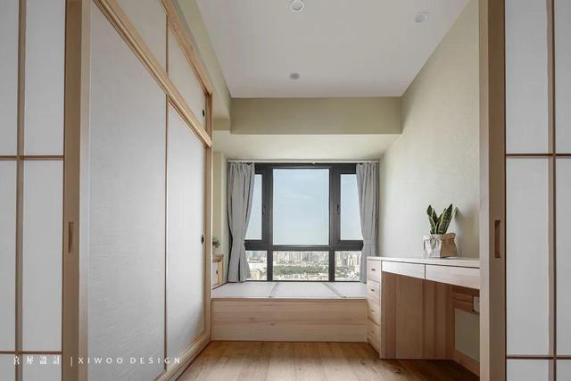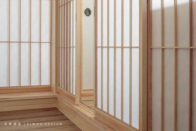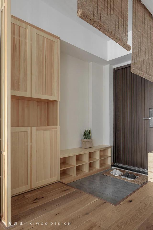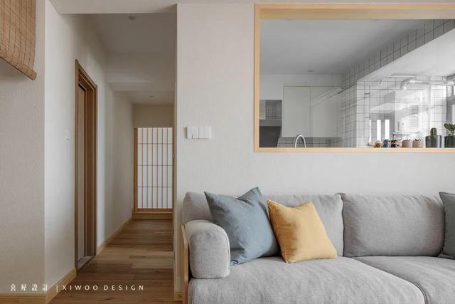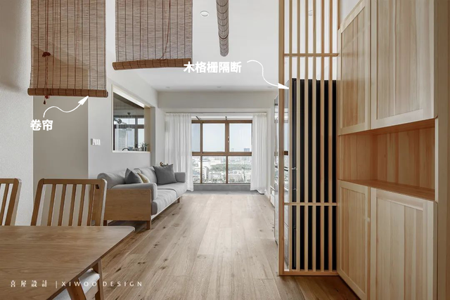 - 在越过餐厅餐桌的水平线后,设计师接续开放格地柜规划了顶天立地的玄关收纳柜,这样让空间可以最大限度地保有呼吸感。  - 屋主还很有仪式感地将餐厅的四周加入了卷帘,营造出禅意、朦胧的气氛,其天然的材质,有一种来自于乡间的稻草味,体现了屋主不俗的品味。 - 正对入户门的位置还增加一处木格栅隔断设计,既有一定的风水讲究,又能有效地遮挡冰箱,让家更显端庄、自然。 - 客厅  - 对于在城市中生活的人们而言,有时总想在繁杂的日常中得到片刻的歇息,而日式风就是最能满足这一需求的家居风格。其打造出来的安静、自然的氛围感,置身其中,既让人感到宁静,也听闻到了来自内心的微声。  - 设计师将客厅与厨房之间的墙体开洞做了室内窗的形式,再辅以浅木色的窗套,这种干净利落的装饰,让空间显得端庄又自然。沙发一旁的正方体边几也与其有一定的呼应作用,让空间有着非常强的立体几何感。  - 日式风格在装饰方面,多选用绿植或者一些十分清淡的装饰画、干净利落的线条勾勒,再配合上大面积的留白,给予人极大的思考空间。  - 从客厅看向走廊,可以看到主卧门也采用了日式风格的木格栅造型,这样的造型文艺范十足,生活在这样的空间里真的可以感觉很放松。餐厅 - 厨房  - 实用的U字型厨房,纹理自然的橱柜样式搭配小方格白墙砖,打造沉稳又清新的烹饪空间。  - 设计师取消了厨房门的存在,这样一来可以缓解走廊的狭长感。至于油烟问题,要考虑到每个人的生活习惯不同,相信很多人平时做饭也都习惯不关门。 - 卫生间  - 卫生间和厨房一样,都采用了白色系墙砖配灰色系地砖的方案。再同步搭配原木色的浴室柜和置物架,把日式风格的精髓渗透进家的每一个角落。 - 主卧  - 主卧一侧带有独立的衣帽间,采用了推拉门的形式,灰色、米色、原木色的结合,非常的自然、放松,一种平静而优雅的氛围感,如同繁忙都市里的一片净土,令人心生安定之感。 - 儿童房  - 儿童房的墙面粉刷了淡雅的浅绿色,再白色、原木色的衬托下,显得卧室干净优雅又有归属感。  - 从这个角度可以看到主卧和儿童房都做了抬高处理,再搭配日式推拉门,打造出纯正的日式风格。 - 说在最后 - 日式风格,是安静淡然、清新素雅的,不接纳过多的喧闹,通过一些简单而质朴的细节衬托出主人的文化气质。本案以精炼的动线、量体、线条感以及适度的留白,凝聚着空间的形与神,静谧的空间里流淌着浓浓的禅意。