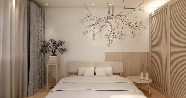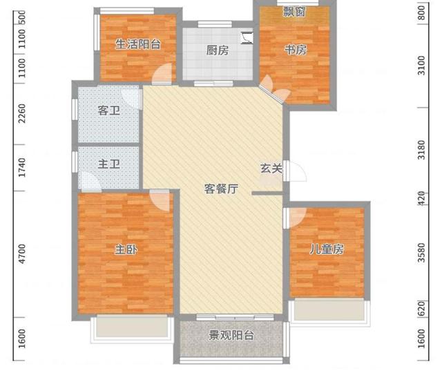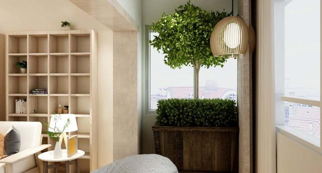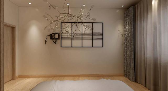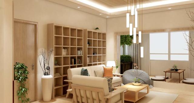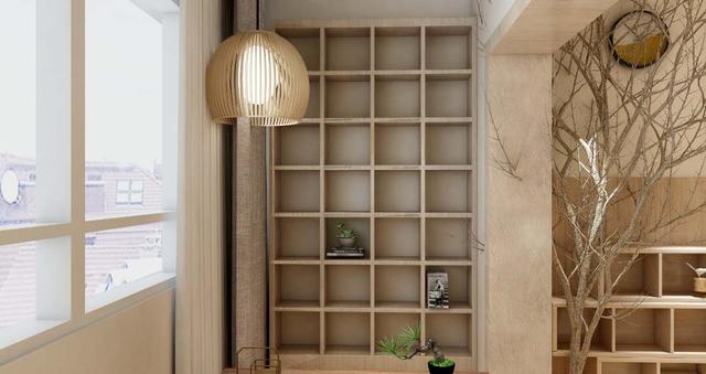 - 本案例采用木质结构,整体设计自然简洁,在空间划分上摒弃曲线,采用清晰的直线条,使居室的布置带给人以优雅、整洁之感。置身其中,触摸着粗大的木结和细腻的木纹,嗅着原木质朴的芳香,看着满眼温暖的木色,感受木材所带来的静谧舒适和心旷神怡。整个家居环境展现了闲适写意、悠然自得的生活境界。  △平面布置图 △平面布置图- 105㎡户型,三室两厅一厨两卫两阳台。南向客厅宽敞明亮,外接观景阳台;客餐厅一体成型,以不同的天花板造型,展现空间的层次;厨房方正实用;三间卧室空间划分明确,主卧拥有大视野的飘窗,且有到顶大衣柜。儿童房朝北,书房设计有靠边写字台和榻榻米床,方便实用。卫生间干湿分区。室内功能划分合理,空间的尺度把握精确。  △客厅效果 △客厅效果- 客厅设计以原木为主,原木色调的沙发背景柜,设计很多隔层,增加储物空间,在两侧摆放装饰品,绿植盆栽,更贴近自然,添加清新感。地面铺设原木色的仿实木砖,木骨架的布艺沙发虽然不如纯布艺沙发的坐感,但是在小巧有型,用在小户型中毫无压力。为了避免配色上的单调,加入活泼跳跃的色彩,如柠黄色抱枕等,展现了年轻人充满活力的生活状态。  - 做实木的综合柜代替电视柜,小巧别致,低调优雅。电视背景墙设计采用纹理自然的瓷砖材料,仿木纹的瓷砖上墙为整个客厅带来了一丝自然之感,与客厅的木质感家具相呼应,具有极佳的装饰效果。  - 电视背景墙边设计了到顶的实木书架兼展示柜,不仅具有实用功能,而且具有软性隔断的装饰效果,弥补了空间的不足,颇有“心机”。  - 在阳台设计多隔层方格架,可以摆放各种展示品,增加实用的功能的同时也增加装饰美。同时在这里安装“鸟笼”造型吊灯,增加创意美,让空间显得更美观。  △景观阳台空间 △景观阳台空间- 同时在这里摆放一盆满满的木质绿植,增加欣赏价值的同时,也能清新空气。现如今,很多人喜欢这样装修,有种治愈系的装修之感。  △餐厅 △餐厅- 禅意的日式餐厅 纯白的空间配以原木色餐桌椅,尽显自然色彩的沉静,线条简洁的吊顶和大开间的落地窗明亮透光。设计师营造了闲适写意、悠然自得的生活境界,或许正是我们所向往的。现代艺术感很强的吊灯,看起来更美观,而墙上的造型看着舒适自然。  △主卧 △主卧- 木饰面床头背景打造禅意卧室 木饰面的主卧背景墙和同色系的衣柜似乎都散发着稻草的香味,朦胧的半透明障子纸贯穿在整个空间。树枝装的创意灯具增加更多的美感,减少空间的单调感。床、床头柜、衣柜为整套实木家具,搭配实木地板和透过纱帘的自然光,卧室显得温和又安静。一盆栽、一盏竹艺吊灯、一个人物摆件,即可营造一处禅意空间。  - 配色丰富的儿童房空间 儿童房在配色上比主卧丰富许多,两幅绿色的装饰画成为空间的点题之物,并与同色系的窗帘相呼应。