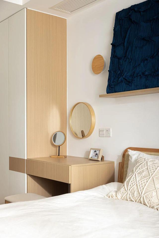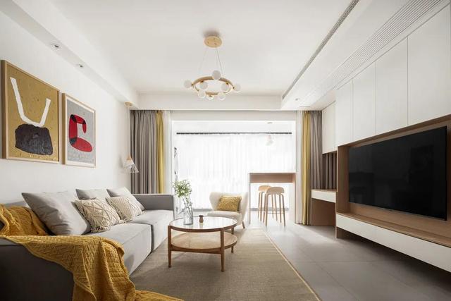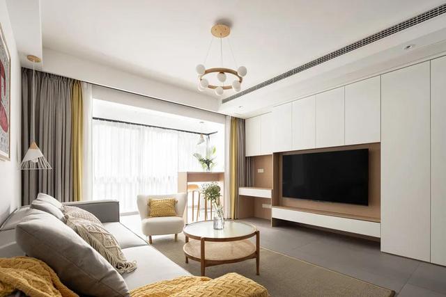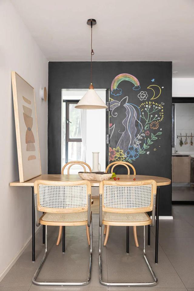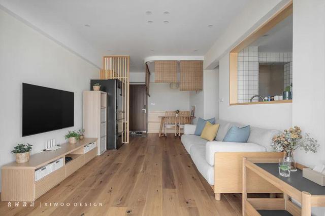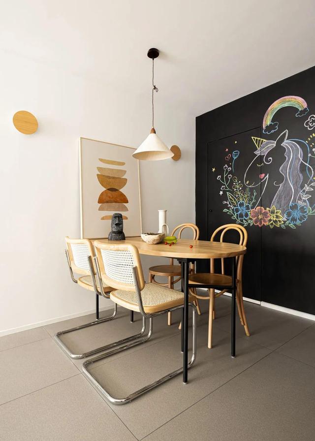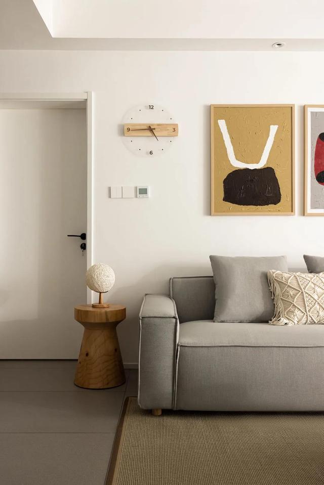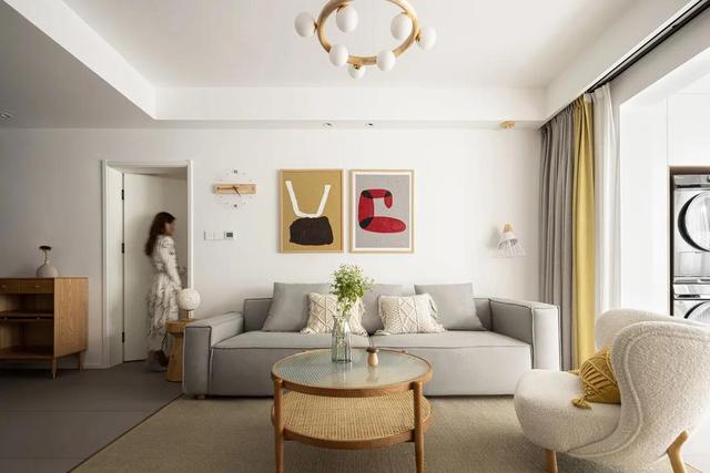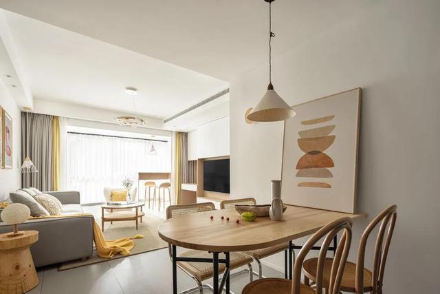 - 屋主是一对年轻的小夫妻,喜欢温馨又质感的日式风格,在这个基础上又增加了一些复古的元素,整体的主色调以灰+白+木色。 - 房子原来的结构存在很多硬伤问题,所以设计师对室内的布局重新做了改造:   - 改造重点: - 1、把餐厅和过道互换,增加厨房面积的同时设计出玄关空间; - 2、客餐厅一体化设计,扩大视觉效果; - 3、改变卫生间开门方向避免入户门正对卫生间门的风水忌讳; - 4、主卧设计步入式衣帽间; - 在这套设计中,除了格局上的改造以外,硬装家具在细节上的处理也很到位还有软装的布置,下面就跟随沐沐一起来欣赏一下改造后的成果吧。 - 一、玄关 - 进门左手边定制组合柜,在这组组合柜中包含了换鞋凳、鞋柜还有随手放钥匙包包和雨伞的地方;  - 考虑到鞋柜不是很大所以只能从内部定制想办法,鞋柜做成了可抽拉式的设计采用横柜竖放,而且内部的层板是可调节的,这样一来即使是换季的鞋子也足够收纳了。  - 二、客厅 - 改造后的客厅将阳台移门拆除把空间纳入到了客厅,扩大了室内的空间感也改善了通风采光问题;客厅以灰+白+木色作为主色调,另外融入了一些亮色作为辅助活跃空间氛围。  - 沙发背景墙大面积留白不做造型只是以简约的艺术画点缀,灰色的布艺沙发带着舒适也带着几分慵懒,这比较符合屋主想要的轻松自由;一旁的吊线灯可以满足夜晚观影或者阅读时的氛围照明,木质藤编元素的茶几、藤编地毯、白色的毛绒单人椅以及个性的吊灯让空间显得更加温润明朗。   - 电视背景墙定制了多功能收纳柜,增加了家里的整体收纳空间,电视嵌入其中也很简洁大方,在靠窗位置预留出一个书桌的空间,这里是女主(幼教)备课的地方。  - 紧靠着女主的书桌是连接阳台的吧台,这是一个纯休闲的空间,可以喝喝茶看看书或者两人坐在这里聊聊天谈谈心都是生活的惬意;   - 阳台的另一边是生活区定制了洗衣机柜把洗衣机和烘干机都嵌入其中,最右侧还保留了一个洗衣池,日常用起来很方便。  - 三、餐厅 - 餐厅不大但是对于小夫妻两个人来说也是足够了,餐桌靠墙放置,一幅装饰画随意的摆在桌面上,极简的吊灯也是很经典的日式风格;   - 餐桌在靠近过道的一侧设计成了弧形这样给路过的人更多的安全感,特意选择了两款造型不同的餐椅,增加餐厅的趣味性;   - 餐厅没有设计餐边柜的位置,但是女主喜欢泡茶和咖啡需要一个放茶具和咖啡机的地方所以就买了一个成品的餐边柜,原木色与长虹玻璃的组合颜值很高,而且矮柜也避免了给空间带来压抑;  - 进入书房的房门在餐桌旁,设计师特意把整面墙连同书房的门都做成了黑板墙,书房以后是个儿童房所以黑板墙的存在也是给孩子的童年增加写写画画的乐趣。  - 四、厨房 - 改造后的厨房借用了原本餐厅的空间扩大了面积,灰色的地砖搭配白色的墙砖和原木色的橱柜,很干净整洁;而且台面做了高低台的设计这样使用起来也更舒适。  - 五、主卧 - 主卧的配色除了延续主题色以外还融入了深邃的蓝色,一抹蓝色从墙面延伸到顶面与艺术画之间相互呼应,很有创意;   - 原木色的鱼骨拼地板搭配带有复古藤编元素的木质床和清新文艺的布艺,颜值非常在线;床头柜和床头靠背保持统一的元素搭配,增添复古气息;床头的壁灯是铝合金表面也挑选了木纹色与整体很和谐;   - 步入式的衣帽间解决卧室收纳问题,墙面安装了穿衣镜不过为了避免风水忌讳特意在衣帽间安装了窗帘,睡觉的时候拉上帘子即可;