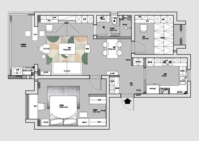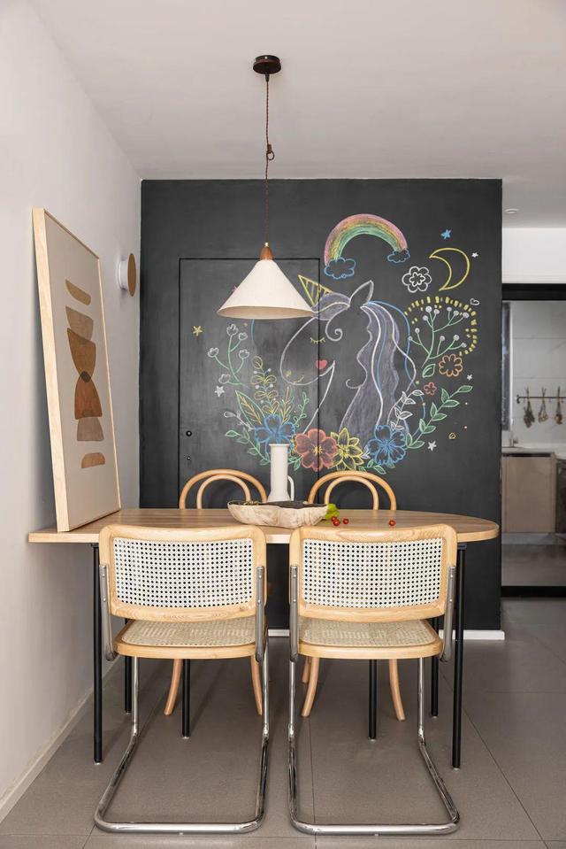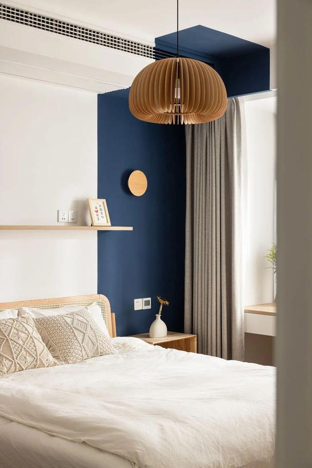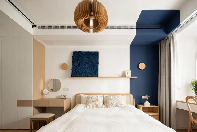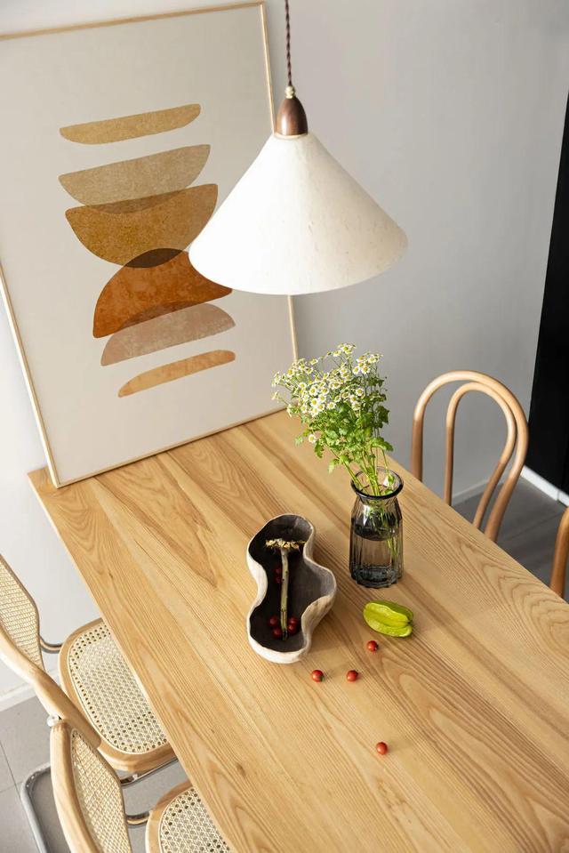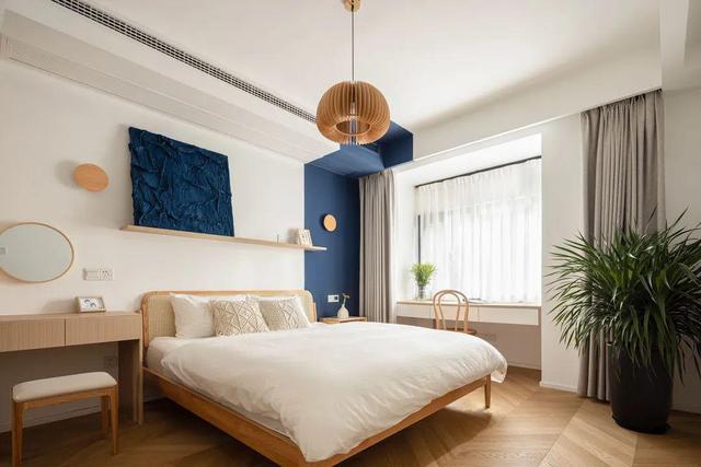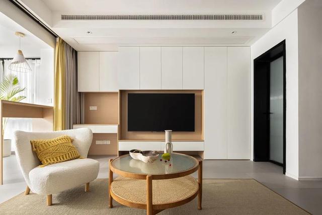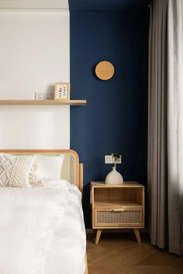 - 屋主是一对年轻的小夫妻,喜欢温馨又质感的日式风格,在这个基础上又增加了一些复古的元素,整体的主色调以灰+白+木色。 - 房子原来的结构存在很多硬伤问题,所以设计师对室内的布局重新做了改造:   - 改造重点: - 1、把餐厅和过道互换,增加厨房面积的同时设计出玄关空间; - 2、客餐厅一体化设计,扩大视觉效果; - 3、改变卫生间开门方向避免入户门正对卫生间门的风水忌讳; - 4、主卧设计步入式衣帽间; - 在这套设计中,除了格局上的改造以外,硬装家具在细节上的处理也很到位还有软装的布置,下面就跟随沐沐一起来欣赏一下改造后的成果吧。 - 一、玄关 - 进门左手边定制组合柜,在这组组合柜中包含了换鞋凳、鞋柜还有随手放钥匙包包和雨伞的地方;  - 考虑到鞋柜不是很大所以只能从内部定制想办法,鞋柜做成了可抽拉式的设计采用横柜竖放,而且内部的层板是可调节的,这样一来即使是换季的鞋子也足够收纳了。  - 二、客厅 - 改造后的客厅将阳台移门拆除把空间纳入到了客厅,扩大了室内的空间感也改善了通风采光问题;客厅以灰+白+木色作为主色调,另外融入了一些亮色作为辅助活跃空间氛围。  - 沙发背景墙大面积留白不做造型只是以简约的艺术画点缀,灰色的布艺沙发带着舒适也带着几分慵懒,这比较符合屋主想要的轻松自由;一旁的吊线灯可以满足夜晚观影或者阅读时的氛围照明,木质藤编元素的茶几、藤编地毯、白色的毛绒单人椅以及个性的吊灯让空间显得更加温润明朗。   - 电视背景墙定制了多功能收纳柜,增加了家里的整体收纳空间,电视嵌入其中也很简洁大方,在靠窗位置预留出一个书桌的空间,这里是女主(幼教)备课的地方。  - 紧靠着女主的书桌是连接阳台的吧台,这是一个纯休闲的空间,可以喝喝茶看看书或者两人坐在这里聊聊天谈谈心都是生活的惬意;   - 阳台的另一边是生活区定制了洗衣机柜把洗衣机和烘干机都嵌入其中,最右侧还保留了一个洗衣池,日常用起来很方便。  - 三、餐厅 - 餐厅不大但是对于小夫妻两个人来说也是足够了,餐桌靠墙放置,一幅装饰画随意的摆在桌面上,极简的吊灯也是很经典的日式风格;   - 餐桌在靠近过道的一侧设计成了弧形这样给路过的人更多的安全感,特意选择了两款造型不同的餐椅,增加餐厅的趣味性;   - 餐厅没有设计餐边柜的位置,但是女主喜欢泡茶和咖啡需要一个放茶具和咖啡机的地方所以就买了一个成品的餐边柜,原木色与长虹玻璃的组合颜值很高,而且矮柜也避免了给空间带来压抑;  - 进入书房的房门在餐桌旁,设计师特意把整面墙连同书房的门都做成了黑板墙,书房以后是个儿童房所以黑板墙的存在也是给孩子的童年增加写写画画的乐趣。  - 四、厨房 - 改造后的厨房借用了原本餐厅的空间扩大了面积,灰色的地砖搭配白色的墙砖和原木色的橱柜,很干净整洁;而且台面做了高低台的设计这样使用起来也更舒适。  - 五、主卧 - 主卧的配色除了延续主题色以外还融入了深邃的蓝色,一抹蓝色从墙面延伸到顶面与艺术画之间相互呼应,很有创意;   - 原木色的鱼骨拼地板搭配带有复古藤编元素的木质床和清新文艺的布艺,颜值非常在线;床头柜和床头靠背保持统一的元素搭配,增添复古气息;床头的壁灯是铝合金表面也挑选了木纹色与整体很和谐;   - 步入式的衣帽间解决卧室收纳问题,墙面安装了穿衣镜不过为了避免风水忌讳特意在衣帽间安装了窗帘,睡觉的时候拉上帘子即可;