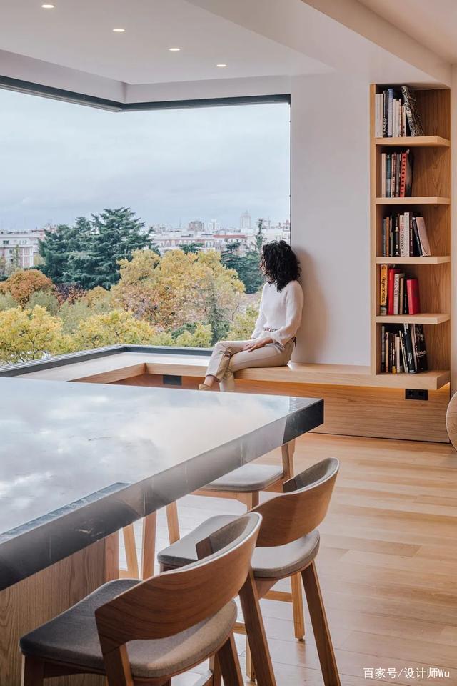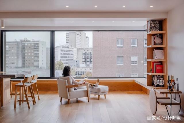 设计师围绕空间的承重柱设计一个吧台,黑色大理石台面搭配木色座椅,与餐边柜板相互呼应。