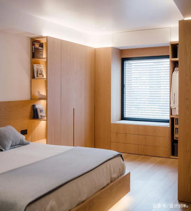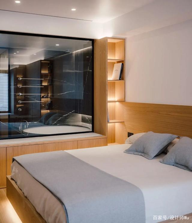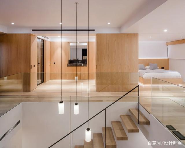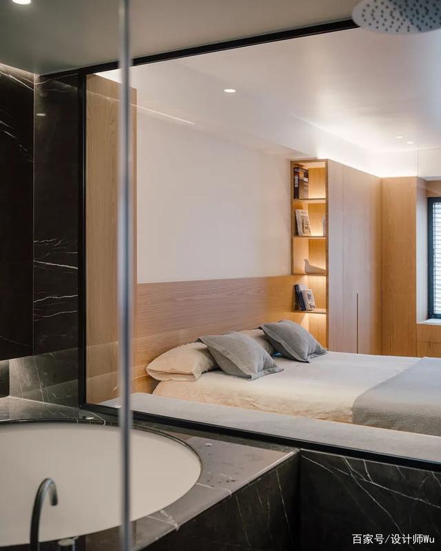 卧室的设计十分简洁,以原木和纯白为主色调,多种柜体的设计增加的收纳空间。通过半高玻璃隔断将浴室与睡眠区进行分割,通过这种方式,形成了一个整合空间。