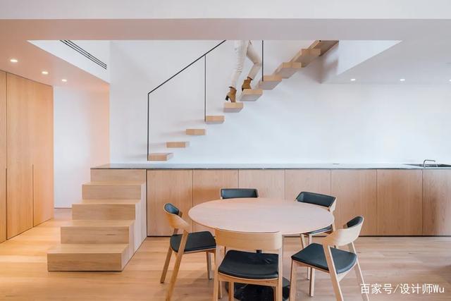 餐厅以一个圆形餐桌为中心,位于楼梯侧旁,与客厅厨房相通,这增加的空间的联动性。设计师巧用楼梯正下方的空间,设计一个餐边柜,不仅提供了收纳空间也便利了日常起居生活。