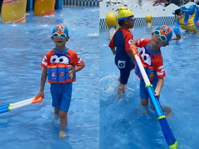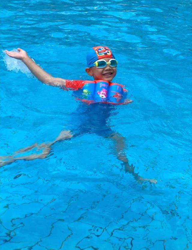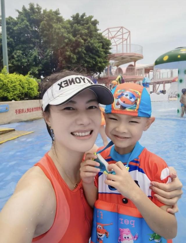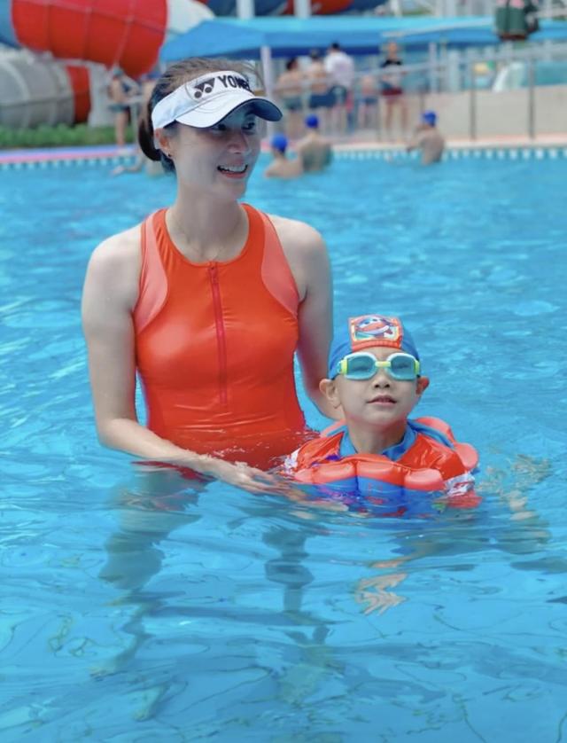 泳衣的正前方有一根长长的拉链,纵向延伸,也能起到延长身线的作用。这次谢杏芳撇开老公林丹,带着4岁儿子去游泳嬉戏,看得出来心情特别好,娘俩都要玩疯了。