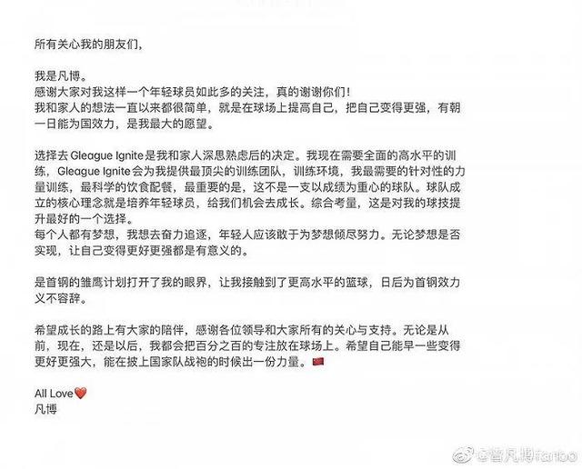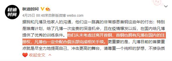 在相关的措辞中,曾凡博及其团队通过自媒体“秋迪时间”首先摆出姿态,表示自己从未想过离开北京首钢,以后从美国归来,也一定会为北京首钢效力。