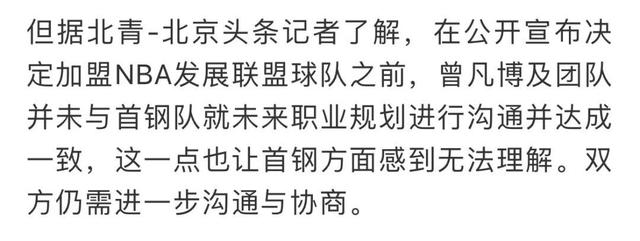 首先,北京首钢方面表示自己并没有跟曾凡博及其团队达成任何协议,双方确实有讨论过“放弃NCAA直接去NBA发展联盟”的事宜,但没能达成共识。