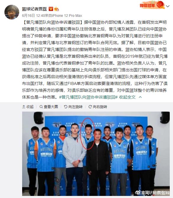 “据了解,目前中国篮协已经官方驳回了曾凡博团队提出的撤销青年队注册的申请。”