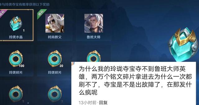- 所以在玲珑夺宝上架了第一时间,很多玩家都想去一睹真容,也有部分玩家按耐不住想要尝试一下的心情,毕竟金币在他们眼里确实也没有什么用,花费个几万金币,十几万金币也感觉不到有什么。 - 那么大家想不想知道花费10万金币究竟能够抽到什么呢?我想大部分玩家多少都尝试了一下,但是也没有死磕,如果死磕下去不知道要浪费多少金币,最主要的是还是奖励不够,让他们心动。 - 我在这里所说的死磕,就是如果没有中大奖,就一直抽下去。  - 要知道,这款游戏大部分玩家都是没有能力去积分夺宝的,我在这里所说的能力就是一直抽,直到抽到荣耀水晶为止。 - 那么我们在积分夺宝上体会不到的快感,可以用玲珑夺宝来代替,毕竟金币留着没有什么用,如果花费了十几万金币去单独的过个瘾,也是不错的选择。 - 游戏当中就有部分玩家花费了10万金币去参与理论多宝,希望能够过瘾的同时也能够拿到比较好的奖励。  - 可是事实上大部分的连抽都是拿不到任何实质上的奖励的,而在花费十几万金币之后也终于迎来了他玲珑夺宝的第一个大奖,也就是鲁班大师这个英雄。 - 那么在这里我也只能说花十几万买个教训,或者说花十几万过个瘾。 - 既然这个玲珑夺宝上架了,那么你不参与肯定是不舒服的,心里就像猫抓一样痒痒,那么花费十几万金币,最终拿到了一个永久英雄你也是舒服了。 - 不过我有一点不懂的是,既然都有十几万金币去进行零零多宝,为什么还没有这个英雄呢?  - 其实也不怪这个玩家,运气不好,大家可以看一下,官方给出的概率实在是太低了,无论是玲珑水晶还是鲁班大师,亦或者是姜子牙的皮肤,他们的命中概率只有0.01%,换算过来也就是万分之一的概率。 - 如果你真的想拿到这三个当中的其中一个奖励,你还真的就花费10万金币左右,甚至10万金币,你还不一定能够拿得到。  - 之前就说过,在这个模式里面根本就没有任何值得参与,没有任何有价值的奖品,有谁会去在这个模式里面死可呢? - 大家不妨换个角度去考虑一下,如果你是一个老玩家,你的金币已经有几十万,甚至100万了,那么用玲珑水晶兑换了这些回城特效也好,头像框也罢,你会没有吗?这些都是以前最基本免费就能获得的产物。