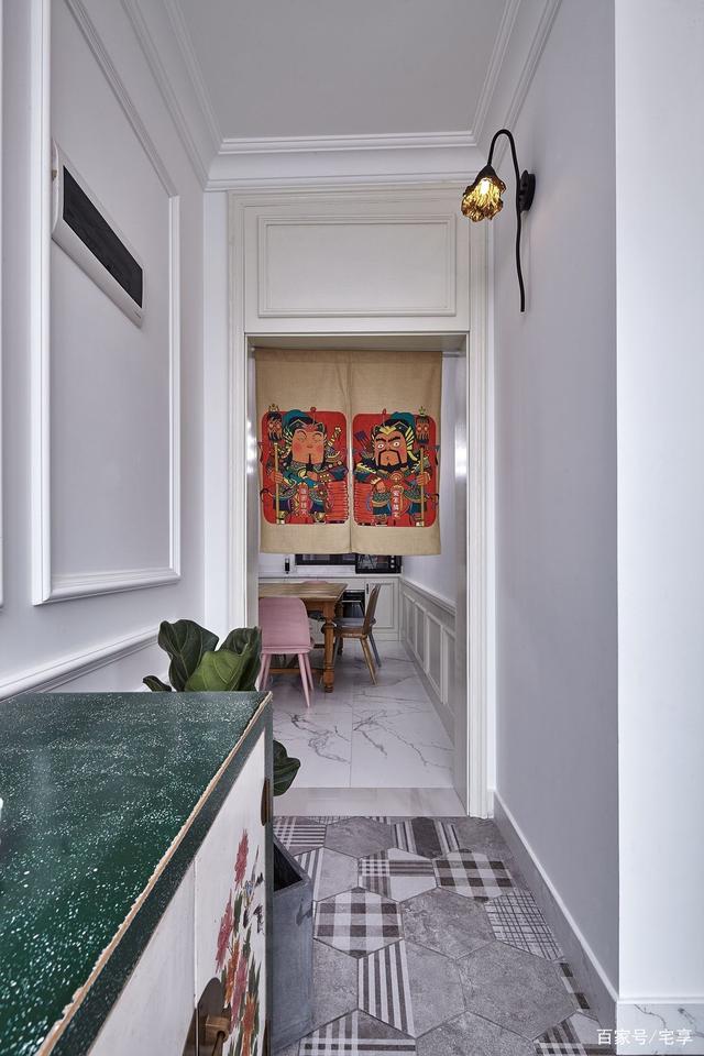 玄关的地面选择了不规则的六角形地砖,深色的地砖清洗起来更加的方便,同时也成为了玄关和客厅的一个隔断。过道的门洞还添加了一个很有创意的布帘,作为隔断的同时也起到了装饰的作用。