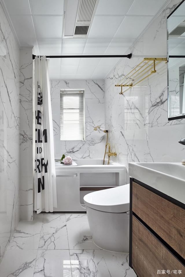 卫生间将浴缸和淋浴区域结合在一起,大理石和金属结合的设计,让卫生间看着更加清爽。