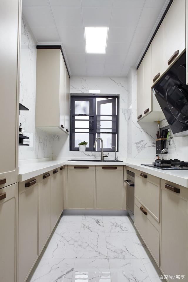 厨房选择了米色和黑色结合的设计,简单的把手方便使用,实木的把手也不会碰伤手指。