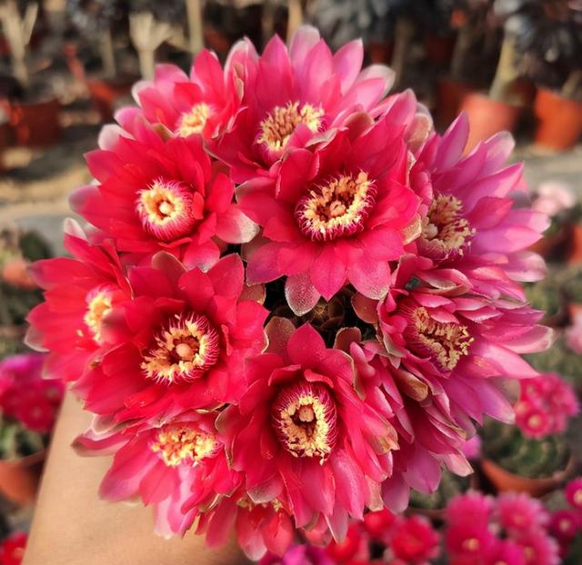 绯花玉,要聊仙人球,第一个要聊的就是绯花玉。作为仙人球里最出名的一个品种,一直有着“开花机器”的美称,而且非常的好养。绯花玉在开花时,所有的花朵集中在球体的顶端,花色也非常的丰富,有白色,粉色和红色,还有各种复色花组成的。