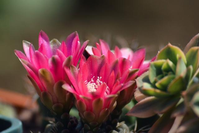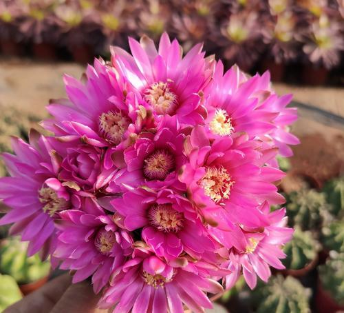 整个夏天都是绯花玉的盛花期,一般是5月到12月的中旬,在这期间,浇水的时候,可以加入一些磷钾肥,一个月一次复合肥,能促进它多开花,花色艳丽,很多花友选择绯花玉,就是因为它的花期实在太长了,放在窗台、阳台或是打造沙漠花境都能收到不错的效果。