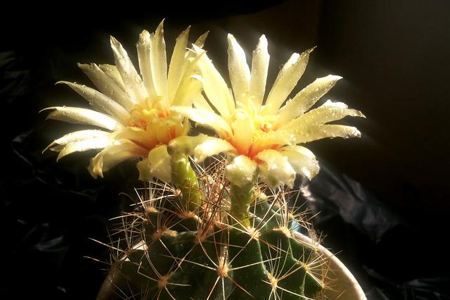龙王又叫做左旋右旋,是一种比较常见的开花性非常强的仙人球,是一种生性很强健的仙人球,夏天就是放在外面淋雨也没问题,而且它的刺比较软,不怎么扎人,最神奇的是只要温度合适,它四季皆可生长,虽然自然花期是5-7月,但是只要条件合适,四季皆可看到它开花,耐寒性及耐热性都不错,能耐0度的低温,南方地区,很多人养龙王,都是把它放在室外养护,几乎不怎么管,就能年年开满花。