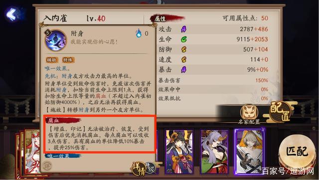 - 腐血、附身机制: - 入内雀作为SR阶式神,他的基础面板数值中规中矩,技能伤害也在情理之中。不过令人眼前一亮的是他拥有全新的机制腐血与附身。首先来简单说明附身机制,先机会附身于攻击最高单位,被附身单位防御力大大增加,受到致命伤害时,消耗附身,扣除当前生命上限到1点,且获得腐血。  - 也就说说被附身的式神拥有两条生命,首次对其造成致命伤害时会被附身机制所抵消,并且该式神可获得扣除生命上限的腐血,并自拉条100%。腐血机制无法被驱散,受到伤害时会优先消耗腐血,降低10%暴击,提升25%伤害,且无法被治疗。  - 可以说这两个机制对于队伍输出拥有强势的保核作用,因此对于入内雀的就业也有了明确的方向。就业有道馆防守与斗技,道馆防守为主要就业,而作为斗技策略卡,暂时还不能很好融入当前版本中。  - 道馆防守+SP花: - 而目前的道馆防守式神主要用到的有SP夜溟彼岸花,夜溟彼岸花最核心的技能就是二技能,二技能失去当前40%生命时,可以向敌方撒出6个溟种,自身进入沉眠,且之后会有各种状态变换,简单来说就是开局无敌免控免伤害,并且溟种数量越多,SP花的输出也越可观。  - 入内雀献祭附身SP夜溟彼岸花,为其抵挡知名伤害,且附身解除之后马上获得100%自拉条,释放二技能后自动进入沉眠状态。而腐血机制也能保证SP花能拥有不错生命保证,在叠伤害同时,保证自身不会阵亡。  - 道馆防守阵容推荐千姬、SP蝉冰雪女、SP夜溟彼岸花、SP骁浪荒川之主与入内雀,入内雀御魂佩戴青女房,246号位分别为速防防。  - 不过目前入内雀道馆防守也有了克制阵容,比如伤魂鸟缚骨清姬,缚骨清姬的蛇灵对于拥有腐血机制的SP花来说有强大的克制效果,导致彼岸花伤害刮痧。不过整体进度较慢,说明防守阵容中有入内雀与SP彼岸花还是比较有挑战性的。  - 斗技部分套路: - 入内雀斗技也有一小部分大佬们逐渐开发了一些套路,比如针对当前版本大热的冲浪队,比较克制浪川的小山风,入内雀可以赋予小山风第二条命,只要能在腐血机制被打出之前,能快速将对方缚骨清姬击杀,之后可以说队伍基本拥有了超大的优势。  - 结语: - 不过关于入内雀的斗技阵容目前来说还是比较少的,因此本篇文章着重分析了道馆防守阵容推荐,以及克制该阵容的式神分享等。关于入内雀的就业与强度,你还有什么其他的想法吗?欢迎在评论区留言哦~