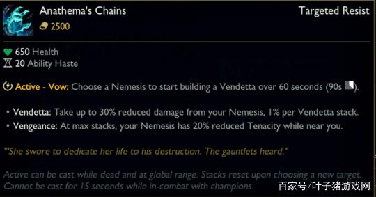 主动技能-起誓:选择地图内的1位英雄作为仇敌,接下来60秒内逐渐积攒[复仇令],冷却时间90s。重新选择目标的话层数将会被重置。该装备死亡后也可以使用,但是无法在与英雄战斗的15秒内释放。