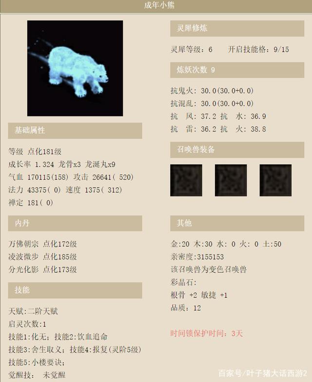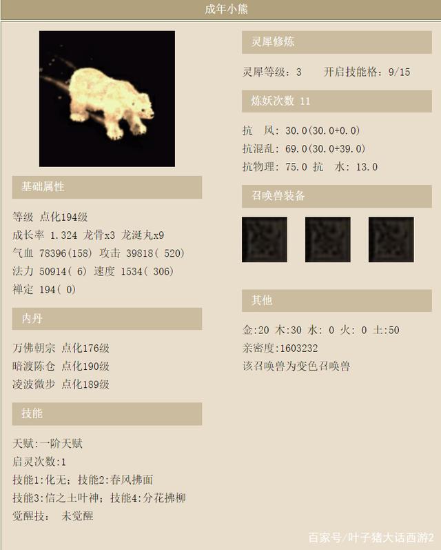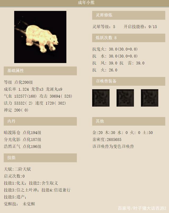 号底子情况第二个号,携带土豪金小熊一头,除化无之外,还有信土分花小当头的组合,这些技能的存在令这只小熊完全可以当做主力宠物登场了,同时这个号的坐骑还算不错,天赋功绩都在及格线之上,售价2万元整你觉得合理么?