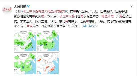 最近江淮南部和江南部分地区仍有中到暴雨。从29日开始,长江中下游的雨明显减弱,高温少雨会逐渐雇佣人。未来三天的天气将以四川盆地、华北和东北地区的降水为主,江南...