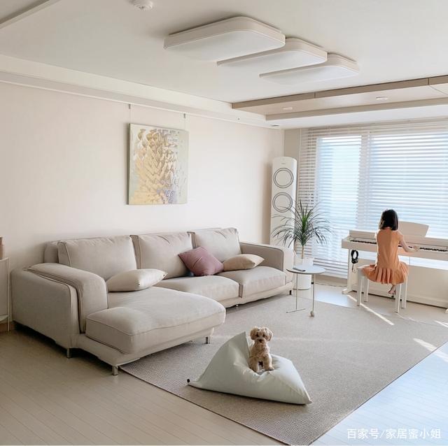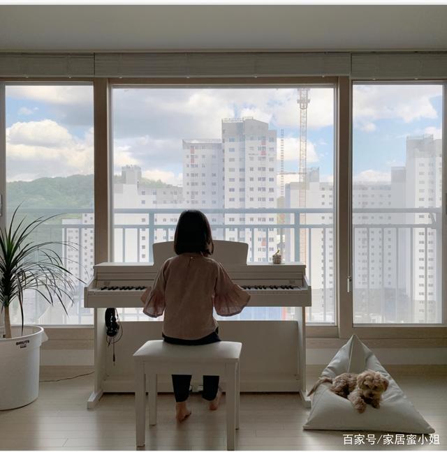 客厅中的布置是非常极简的,除了必要的家具之外,你不会看到多余的杂物,当阳光照射这里,一切都显得格外的美好,孩子正在一旁认真对待学琴,小狗狗也在旁边陪伴着,可能这就是人生的巅峰吧!