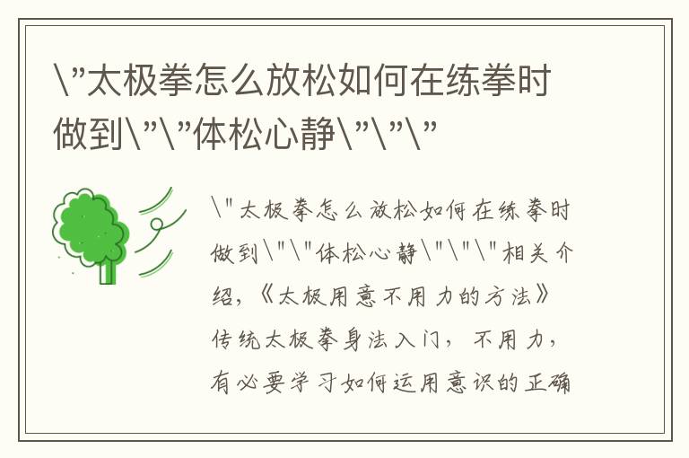 "太极拳怎么放松如何在练拳时做到""体松心静"""相关介绍,第一,学习“知识”才能提高 力量是因为什么?力量是打赌充足的外在表现。这种力量不是困力,而是表面上...