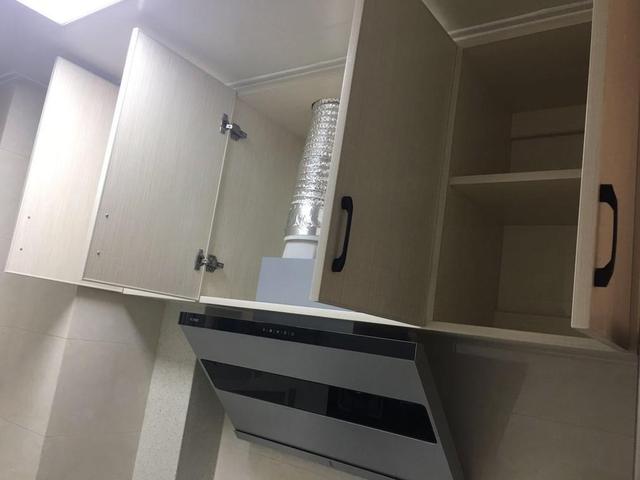 但是有一个门例外,那就是油烟机上方的橱柜门——如果你做了这个橱柜的话。油烟机上面要不要做吊柜,一直是有争议的。最主要的问题,就是油烟机不能把油烟100%吸走,会有一部分油烟继续向上飘,进入到橱柜里。