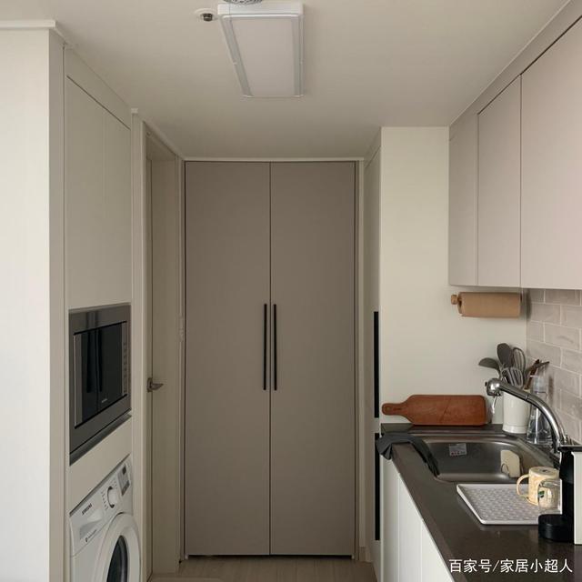 进入到女主的家,你就会看到厨房的设计,她家是没有阳台的装修的,所以就把洗衣机放在了厨房的橱柜旁边,这样使用起来也十分的方便。