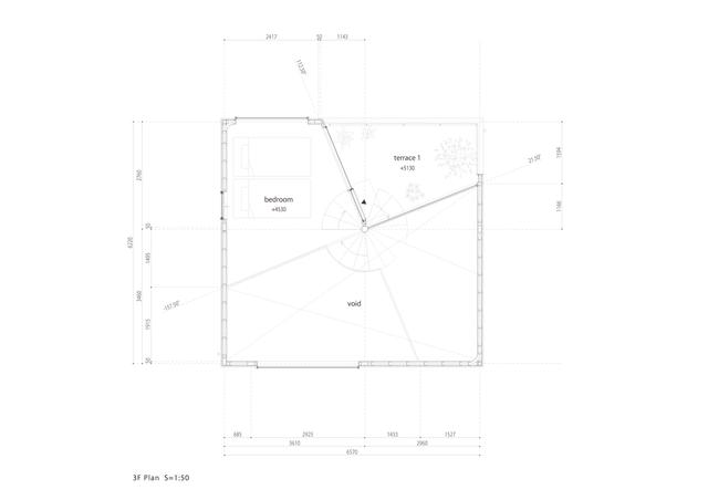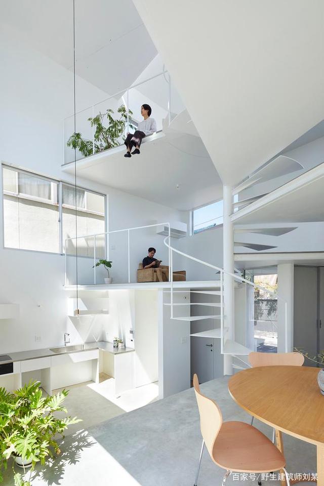 内部空间旋转楼梯作为空间的核心位置,内部空间围绕其以射线的角度进行组织,主要的生活公共空间:起居室、客厅、餐厅等空间位于底部一层,为了让上部夹层得到足够的净空高度,餐厅和厨房局部下沉了600毫米。彼此错开的空间也让内部的空间变得更加丰富有趣,这种空间氛围对于局限的用地来说,是一种极为有利的处理手法。