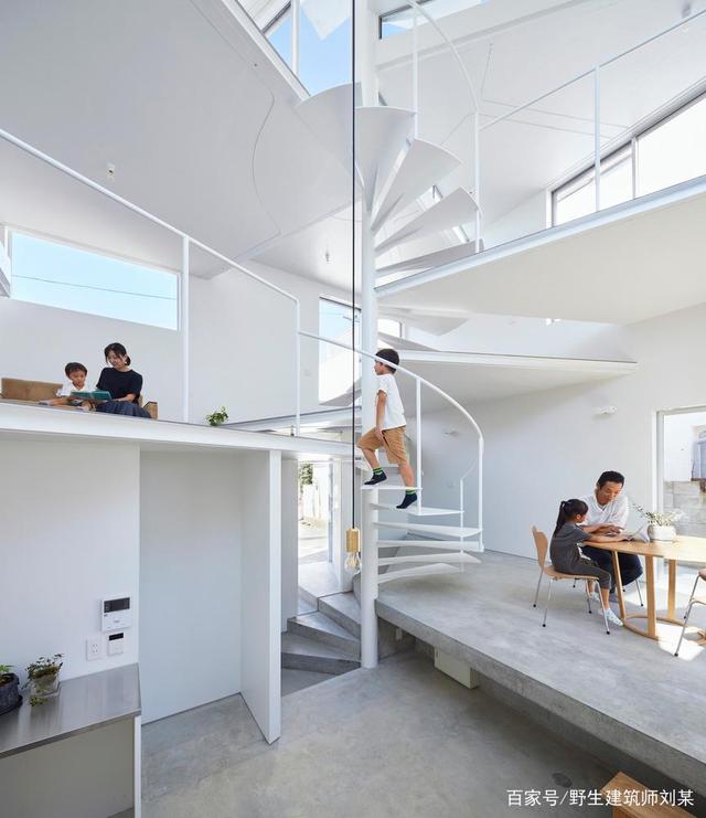 建筑夜景图从首层往上的第一个错层空间是一个图书室,这里可以成为孩子们学习和大人办公的区域,而往上的三个错层空间则是三个孩子的儿童房,彼此相差600毫米的高度,通过旋转楼梯到达。而位于最上部的错层则是年轻的夫妻的卧室,并与一个室外平台相连接,紧接着往上走去便是四个不同标高的屋顶平台,这里是公共的户外活动场所。在如此紧张的用地下,我们纵观整个空间的状态,内部较为通透开放,还有足够多的公共活动区,这或许就是业主对于长期居住的住宅空间所要追求的居住品质。就算是小,也要让其五脏俱全。