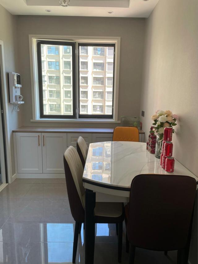 这边是餐厅区域,布置了一张可变圆形的餐桌,可折叠的话相对比单纯是圆形或者方形餐桌会更实用,可以根据人数调节不一样的造型,更灵活使用。平时就是一家三口的话,可以把餐桌往墙体靠,人多的时候可以移动出来,变成圆形餐桌,方便更多人围坐一起用餐。利用窗户的位置设计了非常实用的餐边柜,可以提供蛮不错的储物空间,特别实用。窗户不是很大,不影响采光,室内空间非常通透。窗户左侧安装了一个直饮机,喝水的时候方便很多。