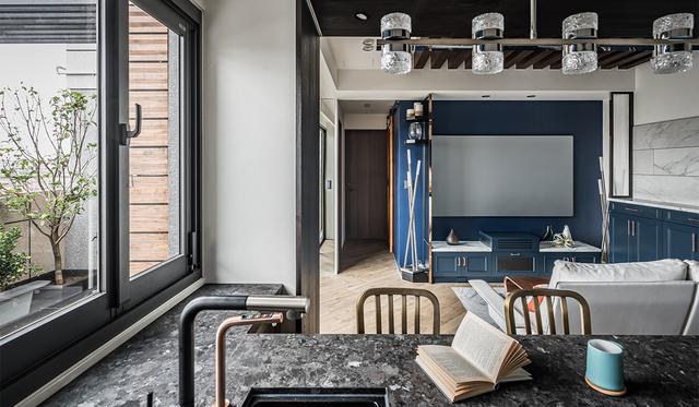 绅士蓝的柜体从玄关一路延伸至电视柜的位置,局部点缀男屋主非常喜欢的金色边框,茶色不锈钢细线条中透着隐约可见、温润遒劲的白色纹理天然大理石,铺垫了精致典雅般的空间基调。